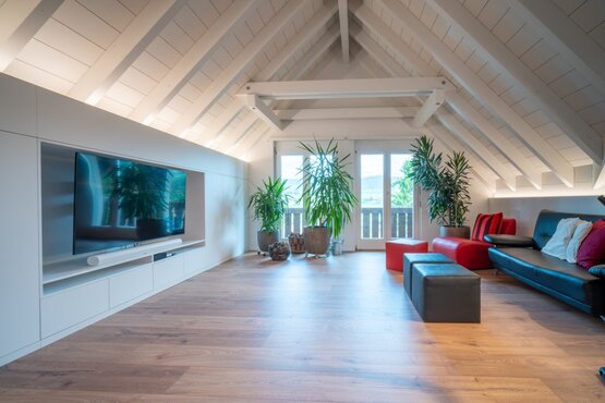 Unsere privaten Auftraggeber gaben uns den Auftrag Ihr Erdgeschoss mit der Küche zu überdenken und neu zu gestalten. Das Dachgeschoss gefiel Ihnen nicht mehr und Sie wollten das für Ihre Bedürfnisse zurechtmachen lassen. Sie waren für alle Ideen offen. Zentraler Bestandteil war die Sauna im Dachgeschoss zu erneuern.