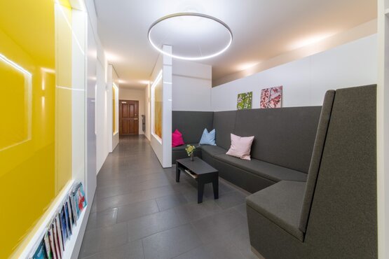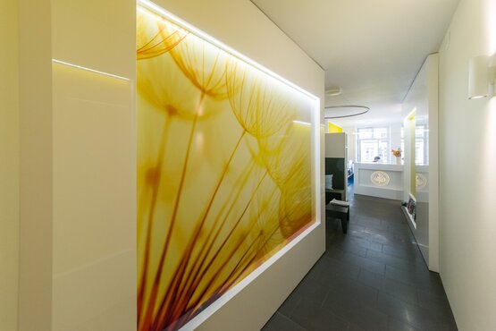Wir nahmen dieses Goldgelb und setzen es als Kraft des Lichtes kombiniert mit den Naturelementen ein. Im anderen standen wir vor der Herausforderung den unendlichen langen Korridor auf irgendeine weise aufzulösen. Das gelang uns mit den schräggestellten Hochglanz weissen Wandelementen, die wir zusätzlich mit dem Naturelement bespielten. Im Zentrum gestalteten wir den Wartebereich, der durch die überhöhen Sitzlehnen zugleich als Raumtrenner dient. In den Toiletten spachtelten wir die bestehenden keramischen Platten und verwenden dort eine Spezialfarbe, die uns das Goldgelb wiedergeben.