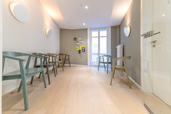 Vor dem Umbau trafen wir einen grossen Raum im Stil der Endsechziger Jahre mit einem gebogenen Empfang und Backoffice an. Einen Warteraum, der zusätzlich mit einem Lager- und Putzschrank bestückt war. Eine abgehängte Tannentäfer Decke schmückte die Decke. Mit dem eleganten vorgesetzten Empfangstresen zeigen wir heute dem Patienten, wo er sich anmelden muss. Durch den durchgehenden Bodenbelag mittels Eichenparkett erhalten wir eine Durchgängigkeit im Boden und verbinden so die Räume zu einem Ganzen. Mit dem neuen zeitgemässen LED-Licht bringen wir, neben dem guten Licht, ein zusätzliches Gestaltungselement. Die grösste Herausforderung war, dass wir nur fünf Wochen Umbauzeit erhielten, was in einem solchen Projekt unrealistisch ist. Dank des Einsatzes aller beteiligten Unternehmen und den Schlussspurt über die Weihnachtstage konnten wir es trotzdem realisieren und mit sechs wochen Umbauzeit pünktlich eröffnen.