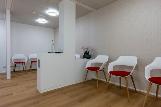 Der Empfangsbereich wurde mit einer eleganten Rezeption ausgestattet, die mit der gleichen strukturierten Tapete, wie an den Wänden gestaltet wurde. Eine Herausforderung für den Schreiner. Bequeme Sitzgelegenheiten mit Sitzkissen in Rottönen laden die Patienten zum Verweilen ein. Stilvolle Kunstwerke an der Wand – abstrakte Darstellung des Herzens – ziehen sofort die Blicke auf sich und setzen einen eindrucksvollen Akzent. Diese Bilder wurden von einem pensionierten Kollegen der beiden Kardiologen extra für die Praxis angefertigt.